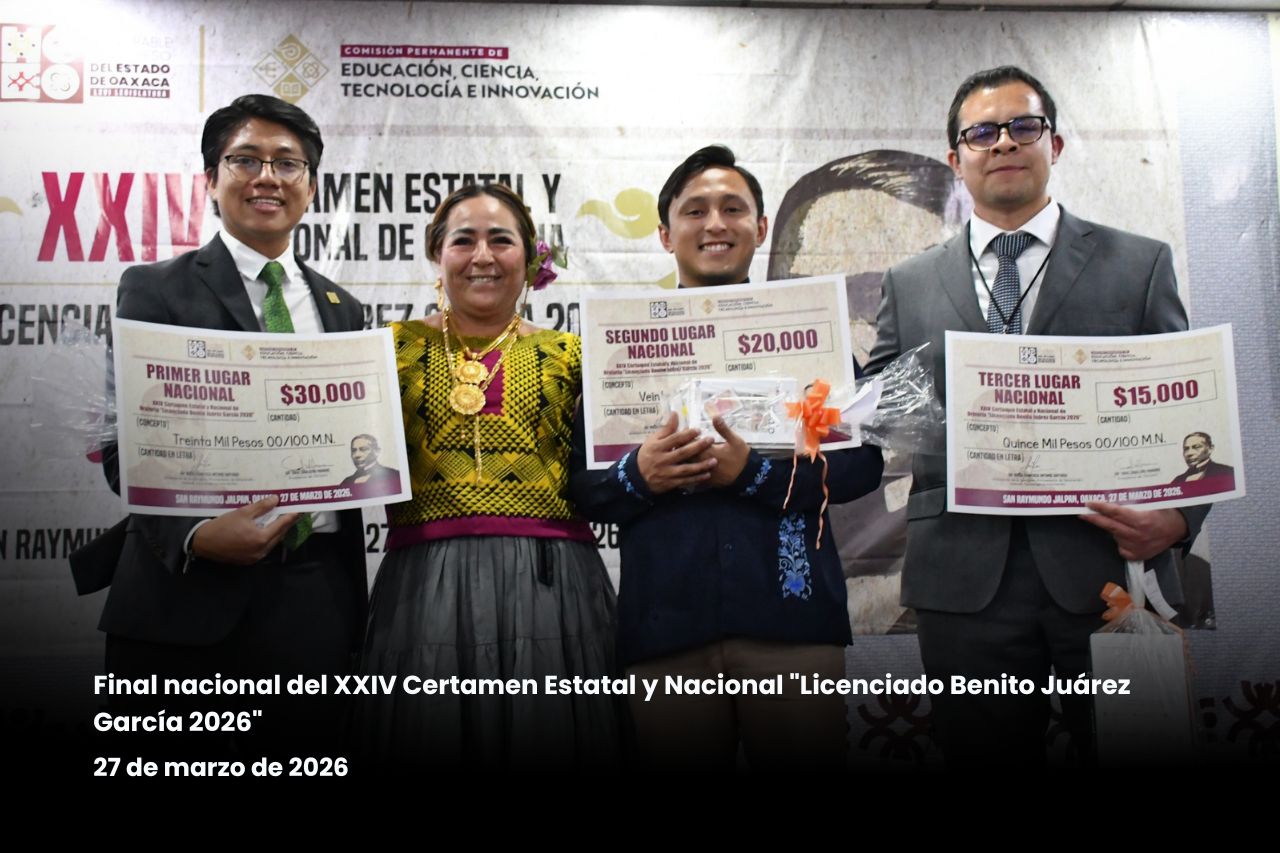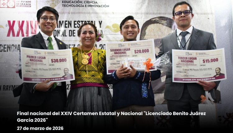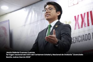 *San Raymundo Jalpan, Oax., a 27 de marzo de 2026.-* Tras una jornada marcada por la excelencia discursiva, el joven oaxaqueño Jesús Gabriel Cuevas Cuevas, de 24 años de edad y originario de Oaxaca de Juárez, obtuvo el máximo reconocimiento en la etapa nacional de la edición XXIV del Certamen Estatal y Nacional de Oratoria “Licenciado Benito Juárez García 2026”, desarrollado en la sede del Poder Legislativo.