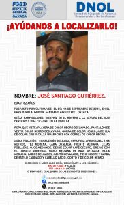 Oaxaca de Juárez, Oax., 17 de septiembre de 2025.– La Fiscalía General del Estado de Oaxaca (FGEO) desplegó un operativo interinstitucional para localizar a José Santiago Gutiérrez, de 62 años, quien fue visto por última vez el pasado 14 de septiembre en el paraje denominado Río Algodón, en Santiago Amoltepec.