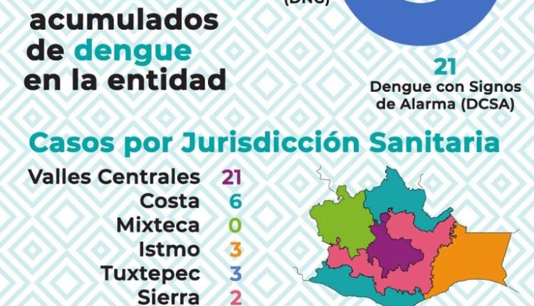 Oaxaca de Juárez, Oax. 31 de enero de 2024.- Los Servicios de Salud de Oaxaca (SSO) informaron que el mes de enero cierra con 35 casos confirmados acumulados de dengue, de los cuales 21 son reportes nuevos, 15 son mujeres y seis hombres.