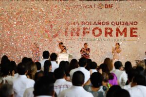 En presencia de cerca de 450 presidentas de los Comités Municipales DIF y de presidentes municipales del estado ,y el arropo del Gobernador Salomón Jara Cruz y su familia, Bolaños Quijano enlistó con seguridad la serie de acciones y resultados obtenidos a través de la implementación de los programas alimentarios, la entrega de los aparatos funcionales y de movilidad, así como de auxiliares auditivos y demás apoyos que están impactando en la mejora de la calidad de vida de quienes más lo necesitan.