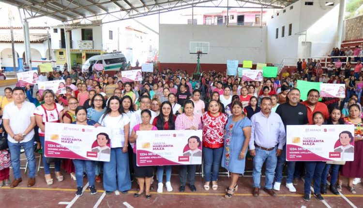 Entrega Primavera Oaxaqueña tarjetas Margarita Maza y Farmacias Bienestar en la Sierra de Flores Magón