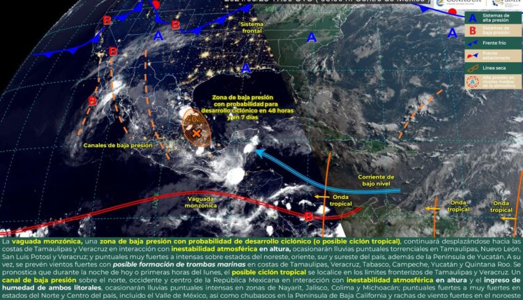 Lo anterior, de acuerdo con el pronóstico del tiempo emitido por la Comisión Nacional del Agua (Conagua) en el que señala que la vaguada monzónica (una región con presencia de lluvias o ciclones que se forma en las áreas tropicales y subtropicales) que se desplaza al pacifico sur, en combinación con la circulación de una baja presión con potencial para desarrollo ciclónico del Golfo de México que se dirige a las costas de Veracruz y Tamaulipas, seguirán ocasionando condiciones inestables sobre el sureste mexicano.