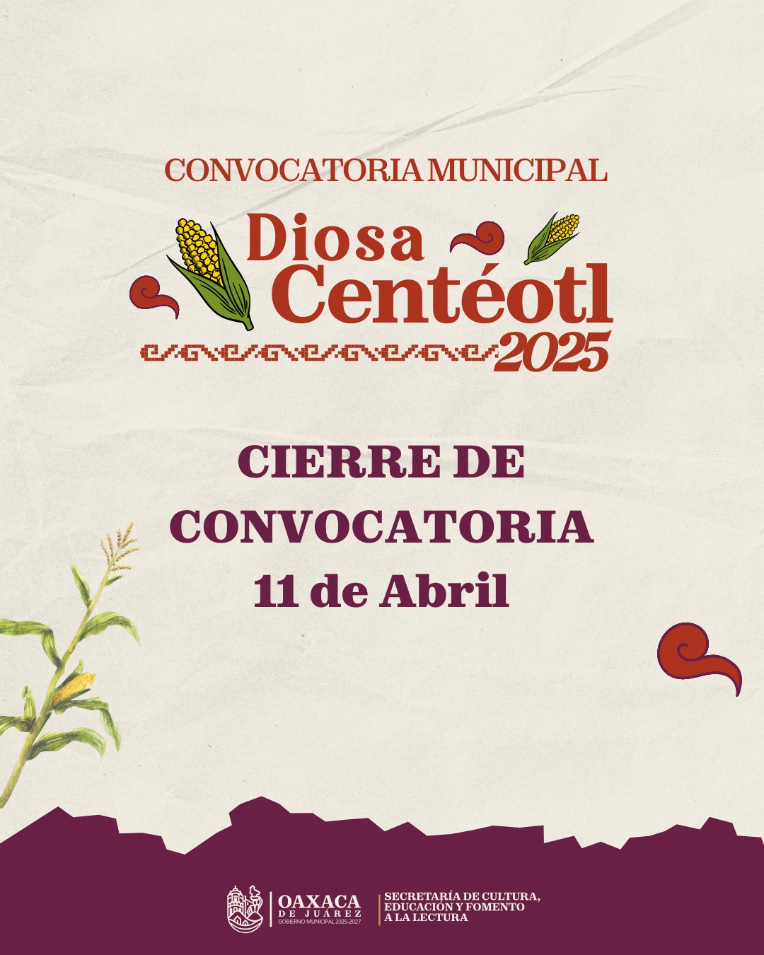 Oaxaca de Juárez, Oax.- El Municipio de Oaxaca de Juárez, a través de la Secretaría de Cultura, Educación y Fomento a la Lectura, hace un llamado a las mujeres originarias y vecinas del municipio para inscribirse en el proceso de selección de su representante rumbo al certamen estatal “Diosa Centéotl 2025”.