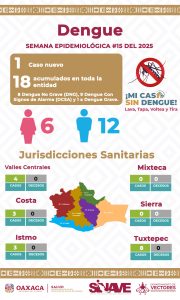 En términos geográficos, la Jurisdicción Sanitaria de Tuxtepec encabeza la lista con ocho casos, seguida por la de Valles Centrales con cuatro, las jurisdicciones de Istmo y Costa con tres cada una, mientras que Mixteca y Sierra no registran casos confirmados. En cuanto a la distribución por sexo, se han notificado 12 casos en hombres y seis en mujeres.