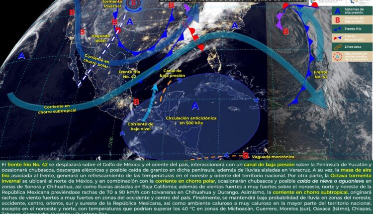 El frente frío número 42 se desplazará sobre el Golfo de México y oriente del país, interactúa con un canal de baja presión extendido sobre la Península de Yucatán, lo que genera todas las condiciones antes descritas.
