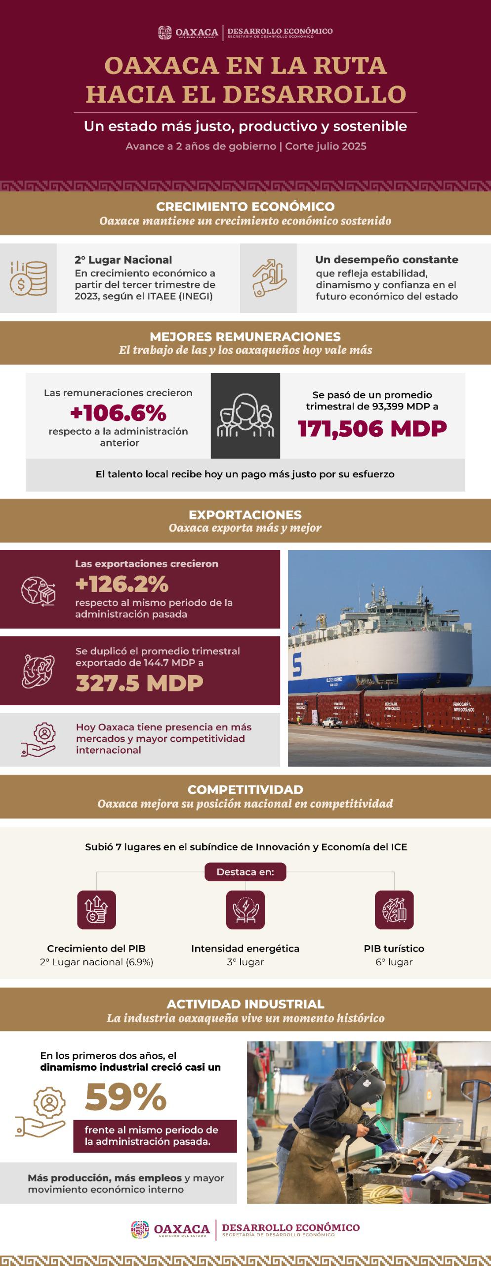 Estos resultados reflejan un periodo de crecimiento económico con fortalecimiento productivo, avances en sectores estratégicos y una mejora en las remuneraciones, que contribuyen a sentar las bases para un desarrollo sostenido de largo plazo, haciendo de Oaxaca un destino cada vez más atractivo para la inversión.