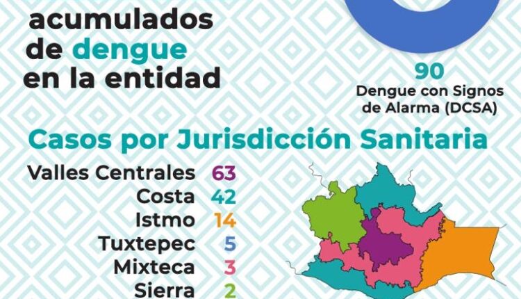 La Jurisdicción Sanitaria 1 Valles Centrales contabiliza 63 casos, la Jurisdicción Sanitaria 4 Costa 42, la Jurisdicción Sanitaria 2 Istmo 14, la Jurisdicción Sanitaria 3 Tuxtepec cinco, Jurisdicción Sanitaria 5 Mixteca tres y Jurisdicción Sanitaria 6 Sierra, dos casos.