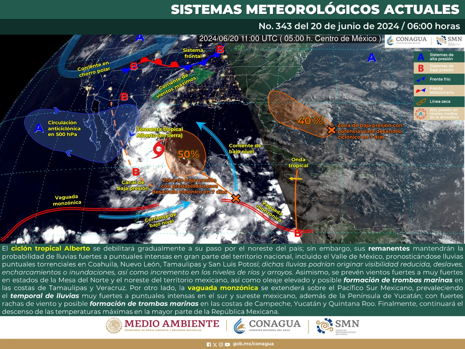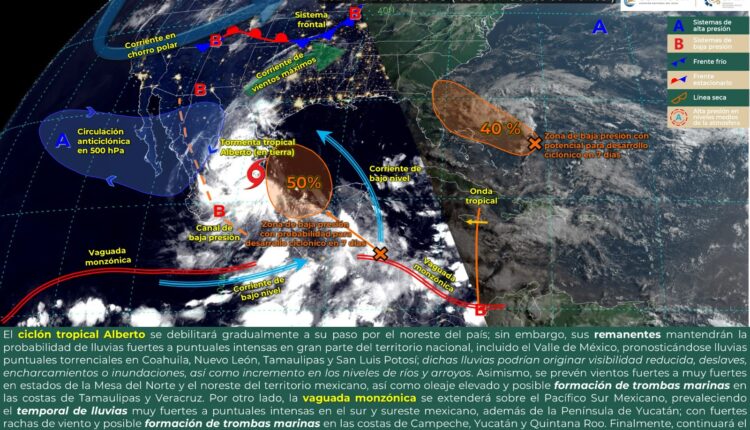 De acuerdo con el pronóstico del tiempo emitido por la Comisión Nacional del Agua (Conagua) el remanente del ciclón tropical Alberto (parte que queda del fenómeno una vez que toca tierra) en combinación con la vaguada monzónica (una región con presencia de lluvias o ciclones que se forma en las áreas tropicales y subtropicales) ubicada próxima al Pacífico Sur, estarán favoreciendo ingreso de humedad hacia el interior del estado.