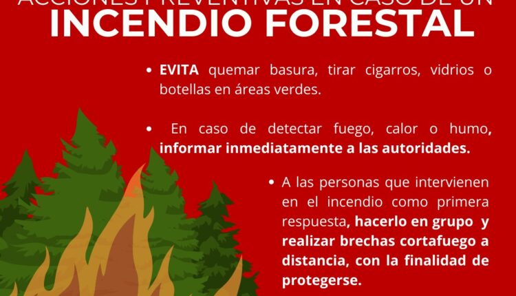 En esta temporada de incendios, la dependencia exhorta a la población a evitar quemar basura, tirar cigarros, vidrios o botellas en áreas verdes, y en caso de detectar fuego, calor o humo, informar inmediatamente a las autoridades.