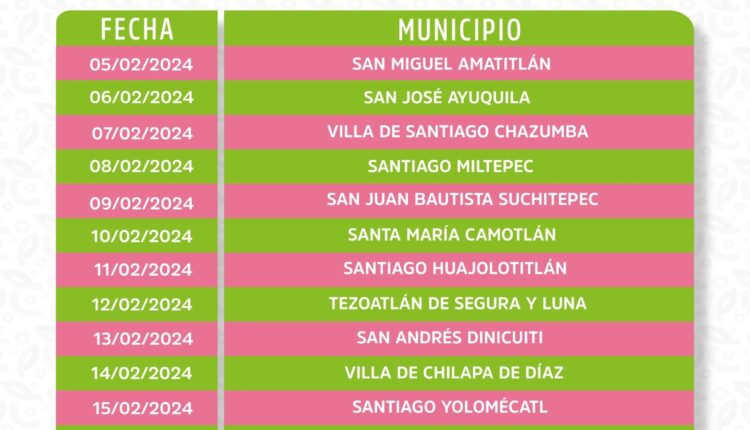 Mientras que el 11 de febrero atenderá a la población de Santiago Huajolotitlán, para llegar el 12 a la Heroica Villa Tezoatlán de Segura y Luna, y continuar su recorrido el 13 de febrero en San Andrés Dinicuiti.