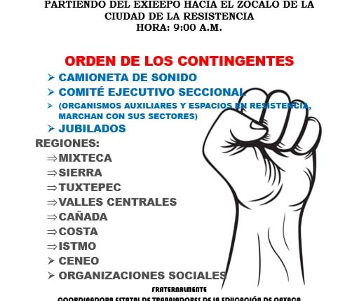 El magisterio oaxaqueño anunció el regreso a clases este lunes 10 de junio para todos los estudiantes de nivel básico vuelvan a las aulas. Acordaron realizar una marcha el día de hoy a las 9:00 horas del ex IEEPO al zócalo y mantendrán una participación del 20% en el plantón nacional.