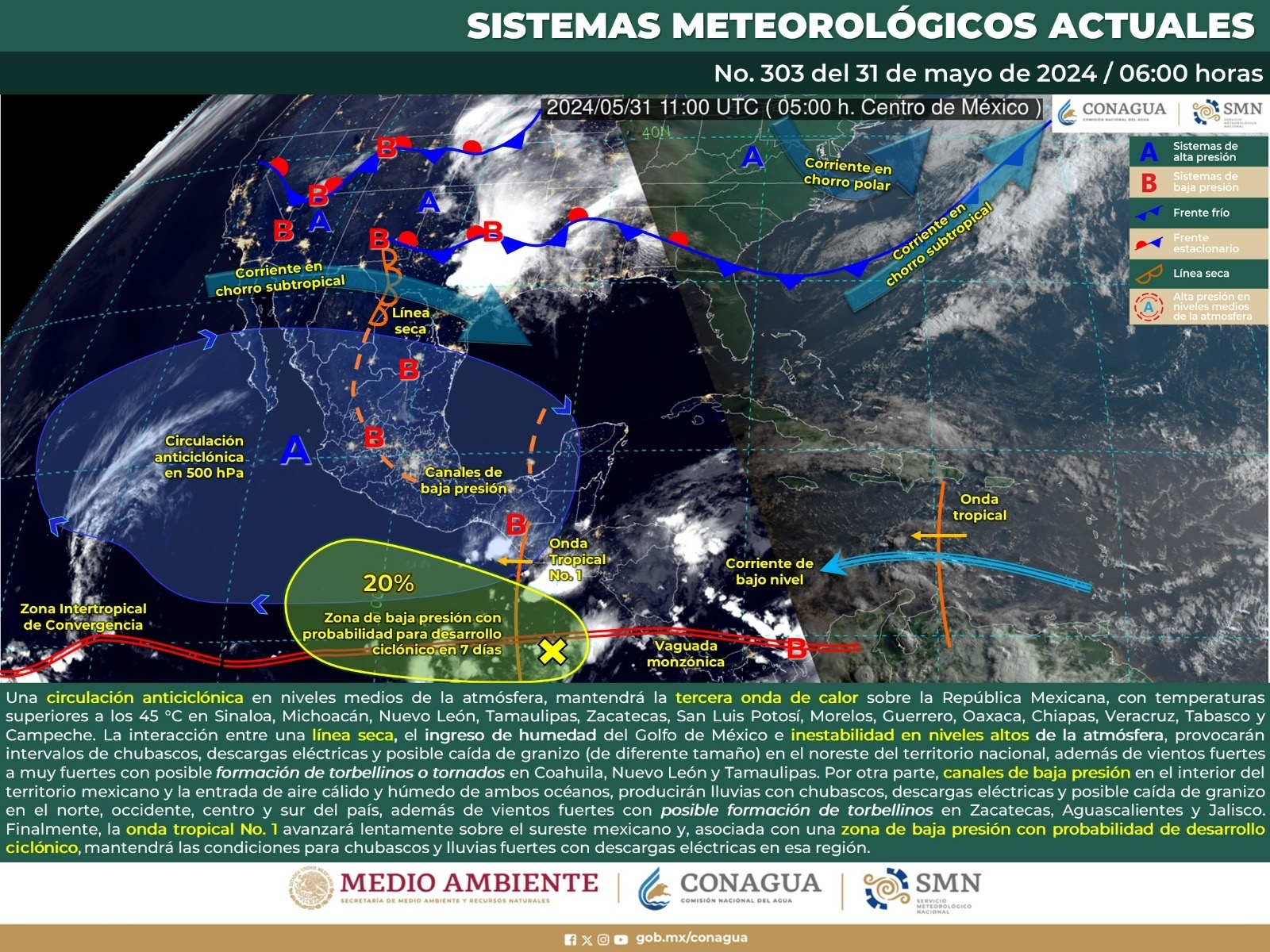 Serán probables algunas lluvias aisladas en la Sierra Sur, Costa, Istmo y lugares aislados de la Mixteca, debido a la cercanía de la onda tropical número uno, asociada con una zona de inestabilidad con probabilidad baja de desarrollo ciclónico sobre el Golfo de Tehuantepec.