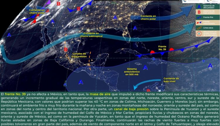 Asimismo, durante el día prevalecerá un ambiente caluroso, mientras que el viento dominante será de dirección norte y noreste de 20 a 35 km/h y rachas, principalmente en el Istmo y Golfo de Tehuantepec.