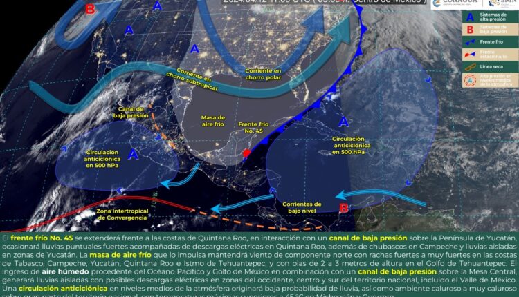 Lo anterior, de acuerdo con la Comisión Nacional del Agua (Conagua) que señala que, estas condiciones son a causa del frente frío número 45, el cual además se extenderá desde la parte norte de Guatemala y Honduras hasta el Océano Atlántico y entrará en proceso de modificación. La masa de aire frío que le da impulso se establecerá como alta presión.