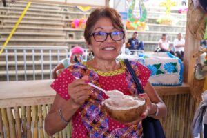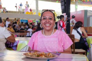 Virgen Hernández Morales representa a la localidad de San Pablo Guilá, ubicado en Santiago Matatlán y está muy contenta de participar por primera vez en este evento acompañada de 41 personas expositoras, ya que pone al alcance del público su inigualable sazón en los moles de coloradito, rojo y negro.